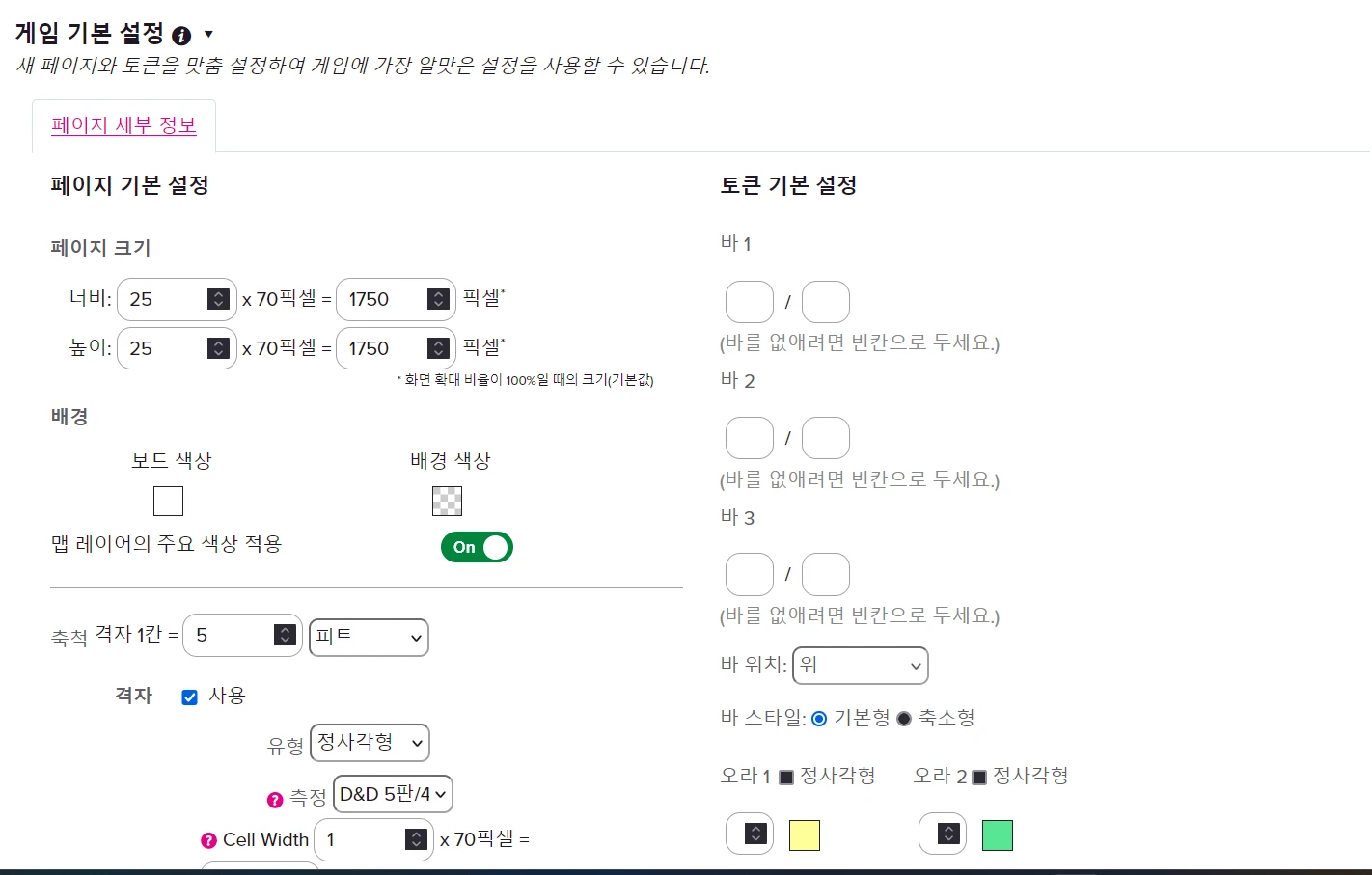 ๋๋ค. 70*70 ๋ฐ์ค๋ Roll20์์ ๊ธฐ๋ณธ ํ ์นธ์ ํฌ๊ธฐ๋ฅผ ์๋ฏธํฉ๋๋ค. ์ฆ ๊ฐ๋ก์ธ๋ก 70์ ๋ฑ ๋ง์๋จ์ด์ง๊ฒ ์ธํ